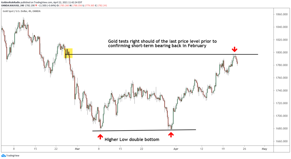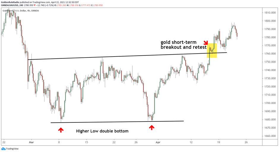 - Gold is stair-stepping toward $1,800 after hitting a double bottom in March at $1,680.