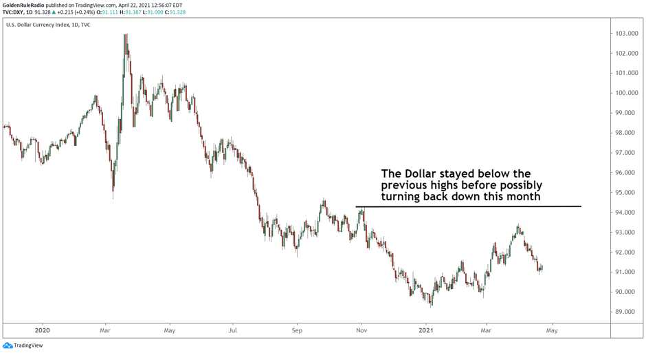 This year the dollar index saw a pop from 89 all the way up to 94, but we stayed pretty substantially below the mid-2020 highs around 95. Without a higher high on the chart, we will assume the long-term bearish trend will continue. The dollar hasn’t seen any real bullish action, just an expected upward correction after significant declines from last summer.