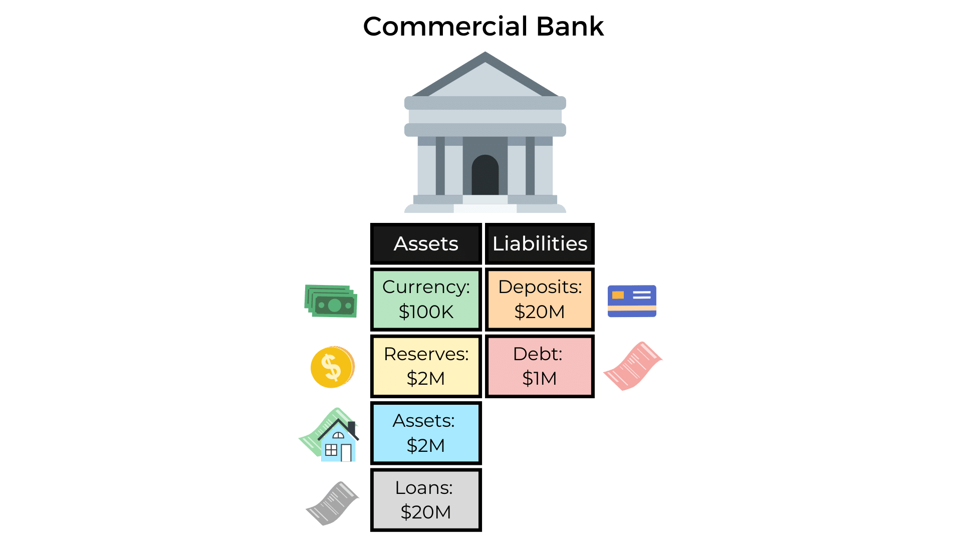 - Commercial bank (stores deposits on behalf of consumers and businesses, gives out loans)