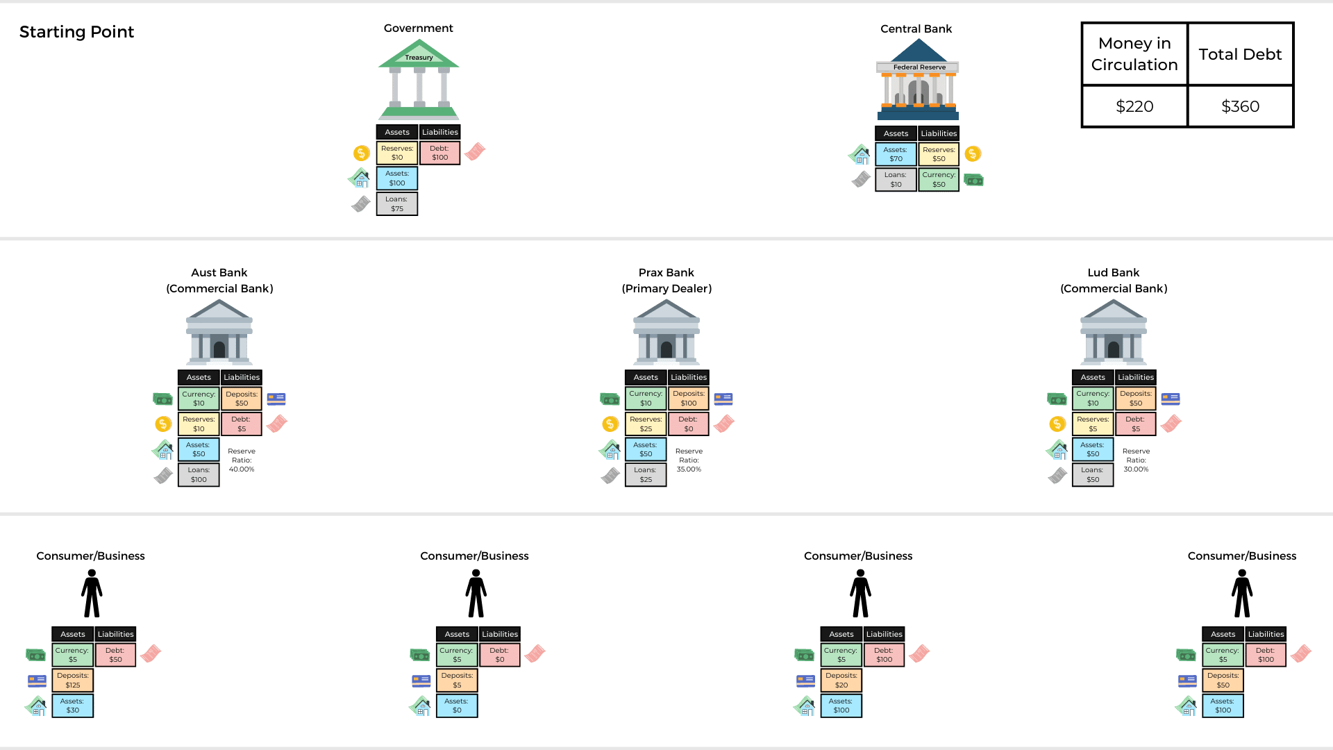 The following model demonstrates how financial institutions exchange assets and liabilities to create money. In this example economy, there is one central bank, three commercial banks, and four consumers/businesses.