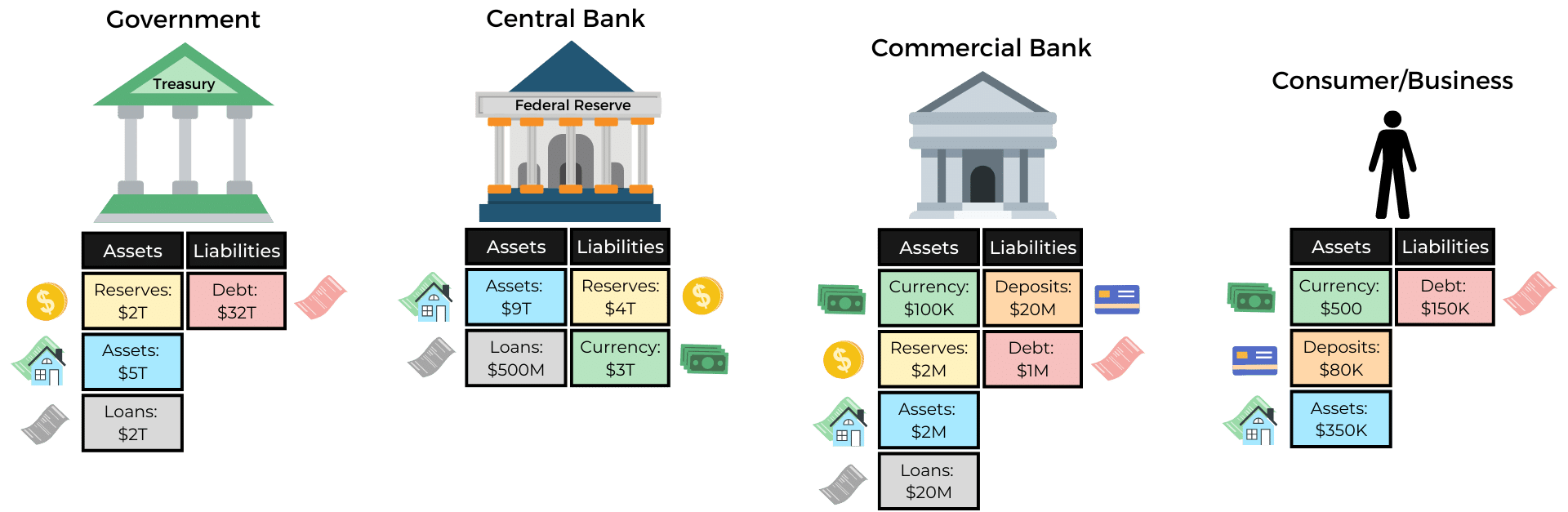Our financial system relies on double-entry bookkeeping, where every debit corresponds with a credit. An arrow pointing to an institution denotes a debit (addition of an asset or subtraction of a liability). An arrow pointing away from an institution denotes a credit (subtraction of an asset or addition of a liability). If an institution is involved in a transaction, it will have exactly one arrow pointing toward it and one pointing away. When assets change hands, it is always the result of an exchange.