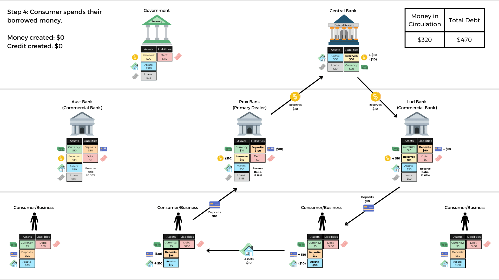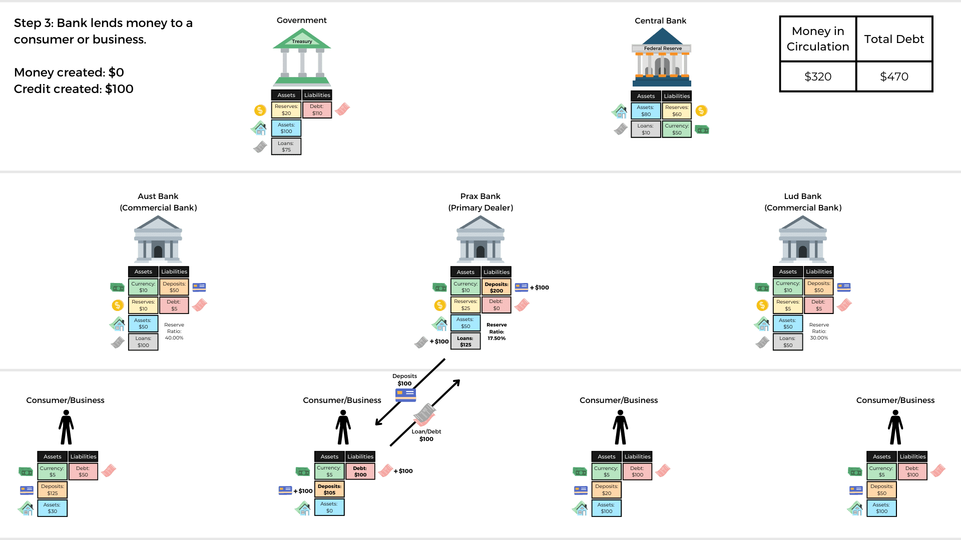 Consumers and businesses borrow money for mortgages, business loans, and other reasons. Notice the lending process increases the amount of money in circulation and total debt by an equivalent amount (in this case, $100).