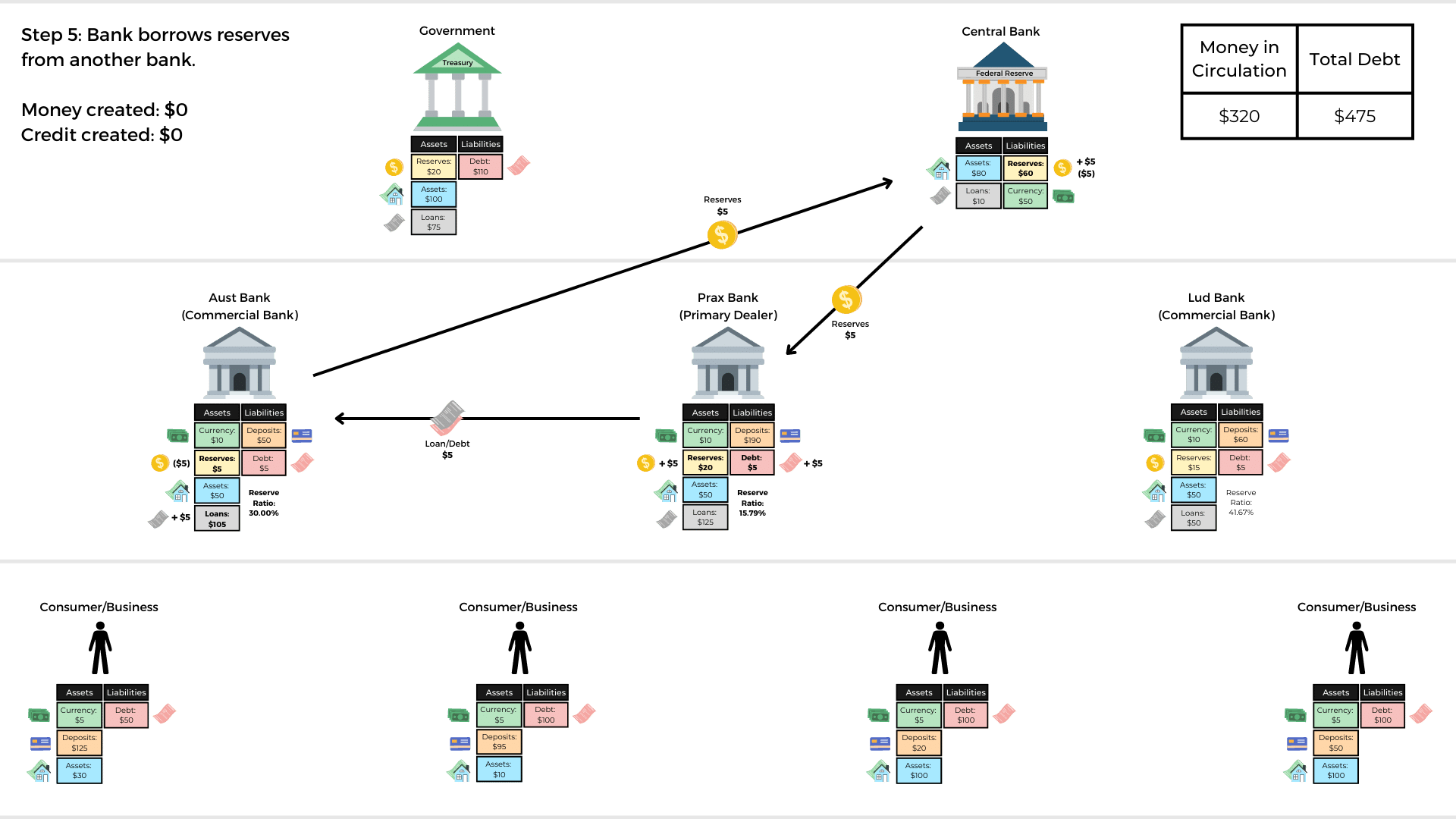 At the end of all five steps, we had $320 in circulation and $475 in debt.