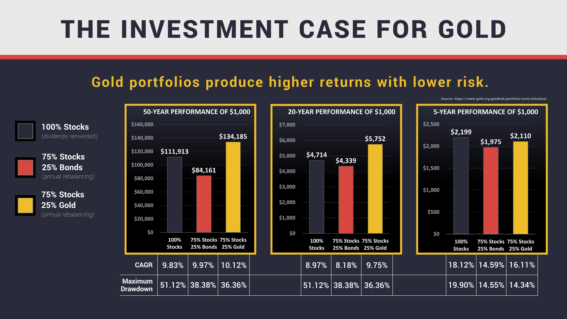When integrated with stocks, bonds, real estate, and other financial assets, gold reduces maximum drawdowns in a portfolio. This held true during the dot-com bubble of 2000, the Great Financial Crisis of 2008, and the COVID crash of 2020.