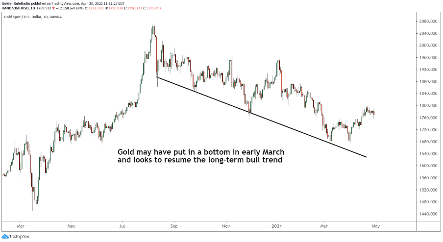 Gold is currently sitting around $1,765 following yesterday’s FOMC meeting, in which Federal Reserve Chairman Jerome Powell reiterated the Fed’s commitment to “keep interest rates near zero,” maintain “sizable asset purchases,” and deliver “powerful support to the economy until the recovery is complete.” In other words, the money will keep flowing.
