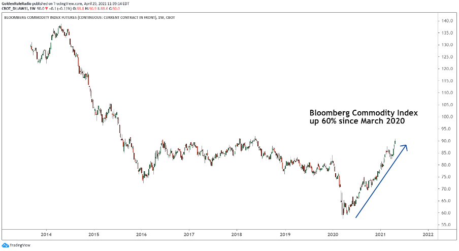 We have several ways of measuring the general price of commodities, such as the Bloomberg Commodities Index. However, it doesn’t take an experienced analyst to notice recent price increases. If you’ve been to the gas pump, purchased food at the grocery store, or heard anything about skyrocketing lumber prices, it probably comes as no surprise that the Bloomberg Commodities Index has been on the rise recently.