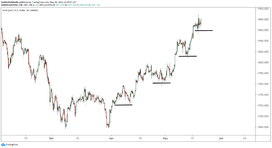 - Gold is holding steady around the key resistance level of $1,885, following two months of higher highs and higher lows.