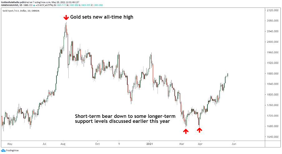 Last August, gold reached an all-time high by pushing above $2,000. The peak sparked a correction that brought gold down more than 18% over a period of seven months, providing wonderful entry points in gold’s long-term bull market. After a rough start to 2021, gold put in a double bottom at $1,680 and began rising above previous resistance levels. Gold needs to continue stair-stepping toward previous peaks before we can confidently claim an end to the bear.