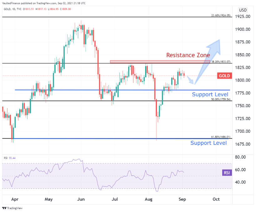 - Gold’s 200-day moving average and 50-day moving average are headed for a “golden cross,” which might be enough to push gold above the $1,837 resistance zone.